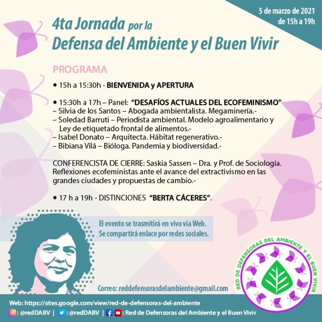 El evento, organizado por la Red de Defensoras del Ambiente y el Buen Vivir como parte de las actividades del #8M y en conmemoración del aniversario del asesinato de Berta Cáceres, se desarrollará a partir de las 15 hs. en el Salón Delia Parodi de la H. Cámara de Diputados de la Nación y será transmitido por Diputados TV y por Youtube: https://youtu.be/tvplFmTlX1M