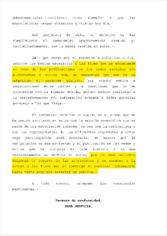 Al mismo tiempo pide que se “disponga la reserva de las actuaciones y se conmine a la actora a los fines que se abstenga de publicar información hasta tanto adquiera carácter de público.
