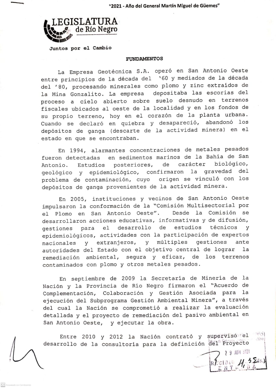 En el día de la fecha el Legislador Juan Martín, del Bloque Juntos por el Cambio, presentó ante la Legislatura Provincial un Proyecto de Comunicación que tal como en el Proyecto de la Legisladora Gemignani, manifiesta al Poder Ejecutivo Nacional «la urgente necesidad de hacer honor a los compromisos asumidos y completar la remediación de los sitios contaminados en San Antonio Oeste como consecuencia de la actividad minera de Mina Gonzalito».