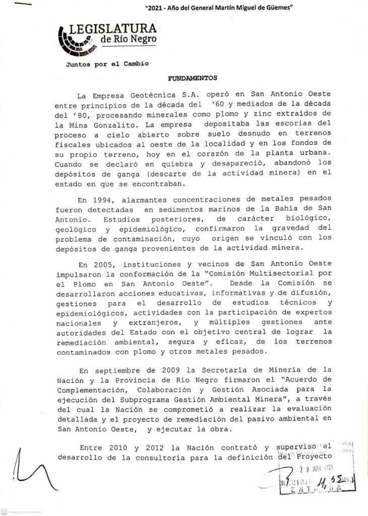 En los Fundamentos, el Legisladora hace un pormenorizado detalle de los sucesos ocurridos en San Antonio Oeste respecto de la contaminación, y en particular respecto de los compromisos asumidos por la Nación desde 2007.