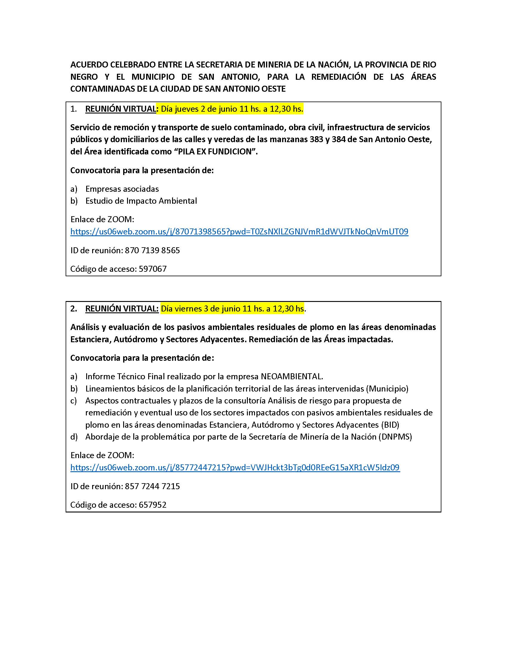 El 26/11/2021 el Intendente Municipal suscribe el Decreto para el llamado a Licitación Pública “Servicio de remoción y transporte de suelo contaminado y la obra civil (…) de las calles y veredas de las manzanas 383 y 384 de San Antonio Oeste.