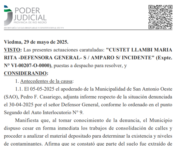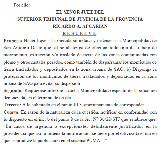 En el día de la fecha la Multisectorial por la problemática del plomo en San Antonio Oeste recibió la resolución del Juez Ricardo Apcarian respecto a los sucesos desencadenados por la Municipalidad de San Antonio Oeste, al utilizar la cantera ubicada en la zona contaminada con metales pesados y sobre la que existe una medida judicial que prohíbe su uso.